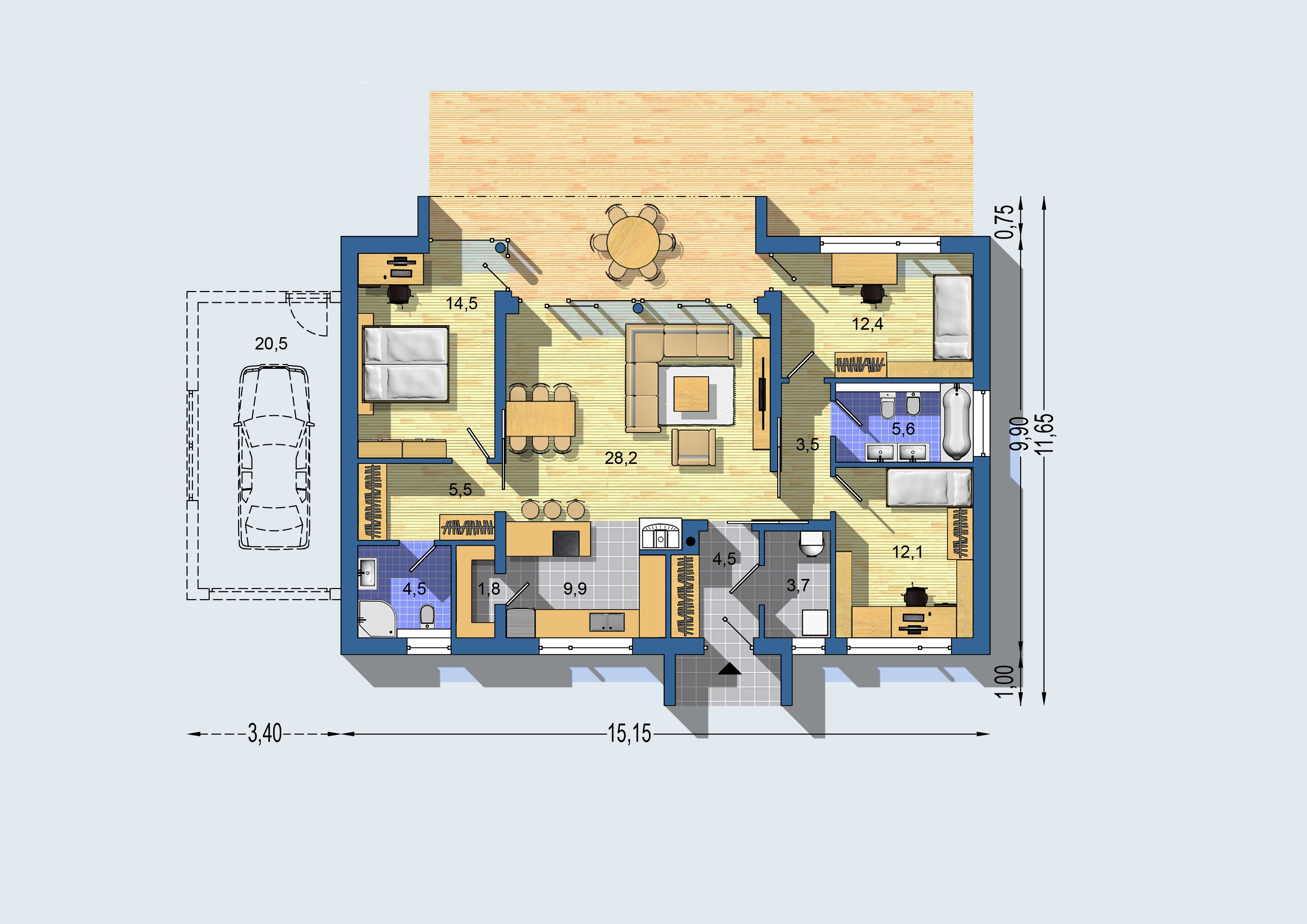 • Hlavní obytný prostor je dobře osvětlený z protilehlých stran a zároveň velká prosklená plocha je chráněná zastřešením.